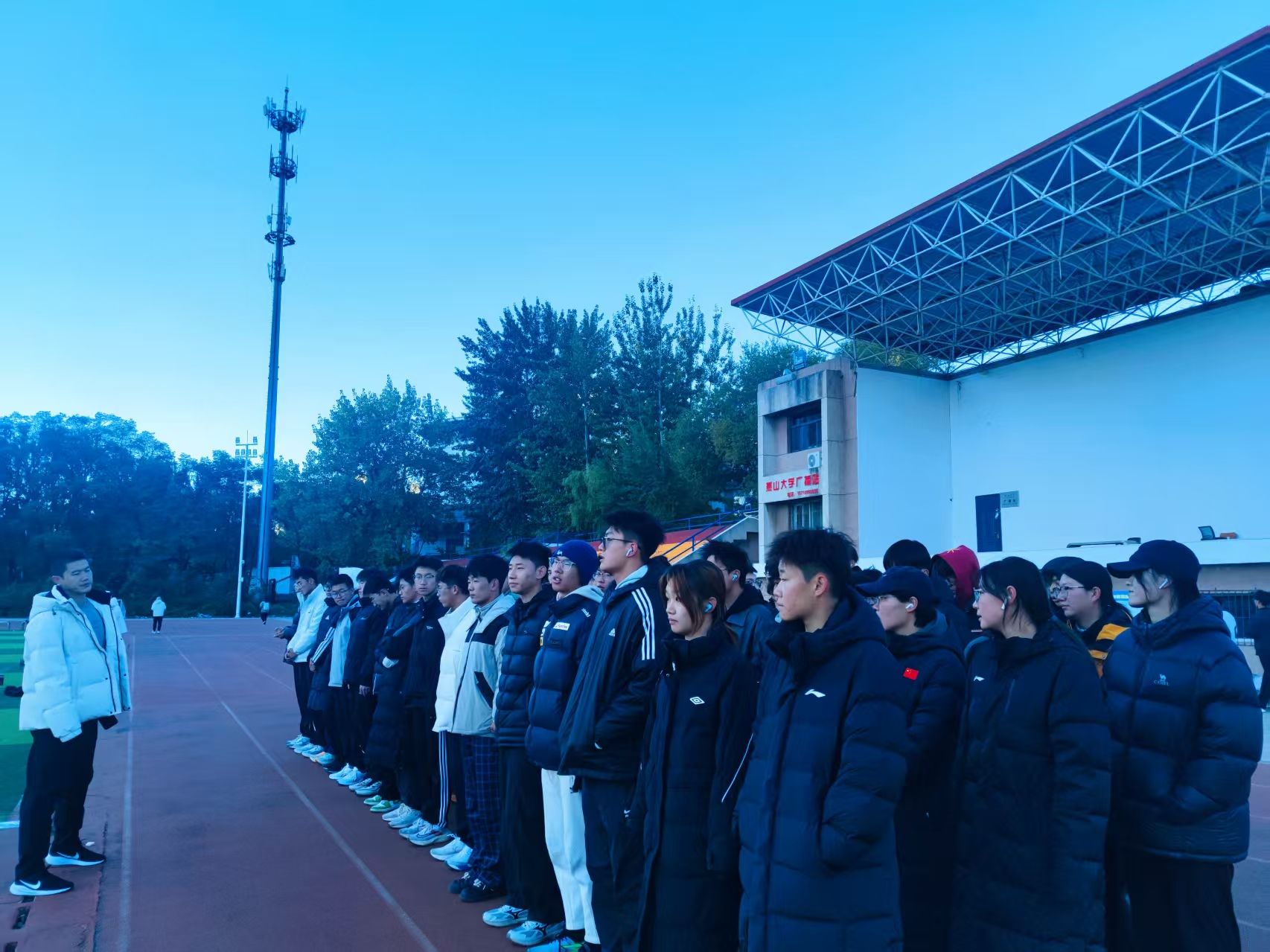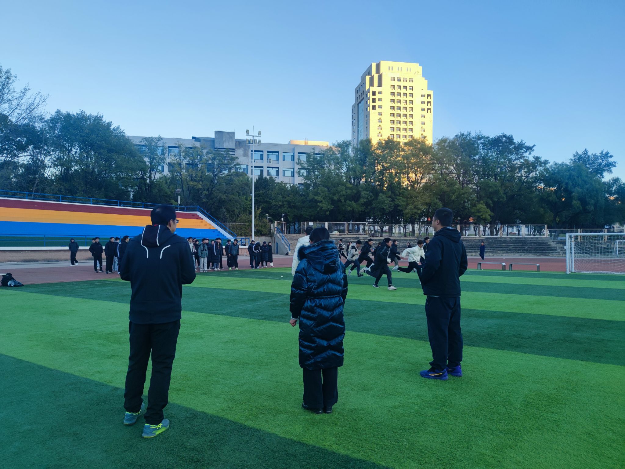 本学期每日早操执勤采用“1名教师+ 1名学院领导” 的搭配模式,12名青年教师(艾志远、孙唯桐、王浩宇、敖雪、张苗、徐阔、田乃元、孙懿、张麟、张琪、于莉华、张旭)根据提前发布的《早操教师轮值总表》轮流执勤,5位学院领导也同步参与每日轮值,确保执勤工作有序衔接,共同督促学生依据刘桦玮老师制定的《冬季早操训练计划》开展训练的情况。