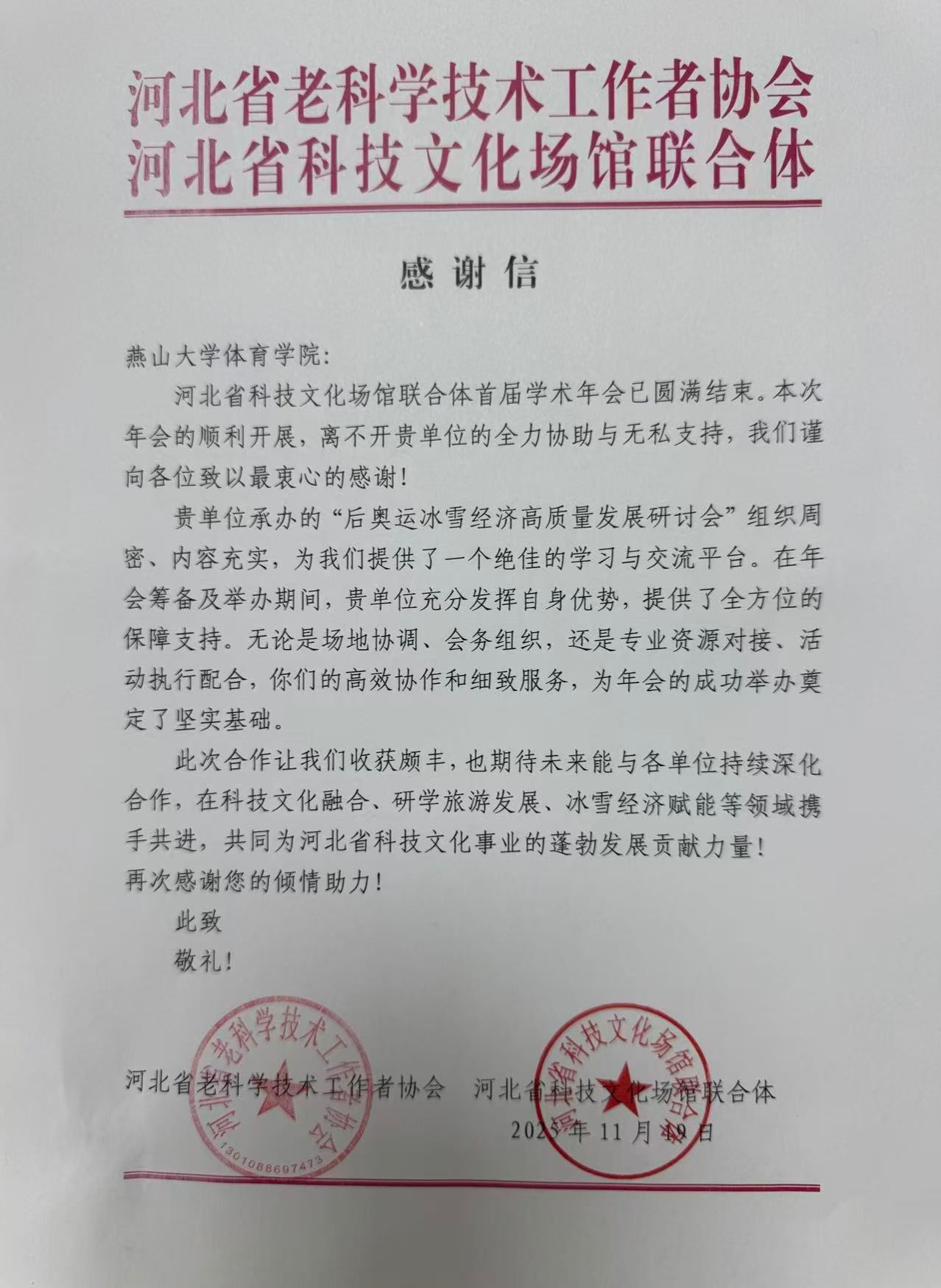 近日,河北省老科学技术工作者协会与河北省科技文化场馆联合体向燕山大学体育学院发来感谢信,对其在河北省科技文化场馆联合体首届学术年会中的突出贡献予以高度赞扬。