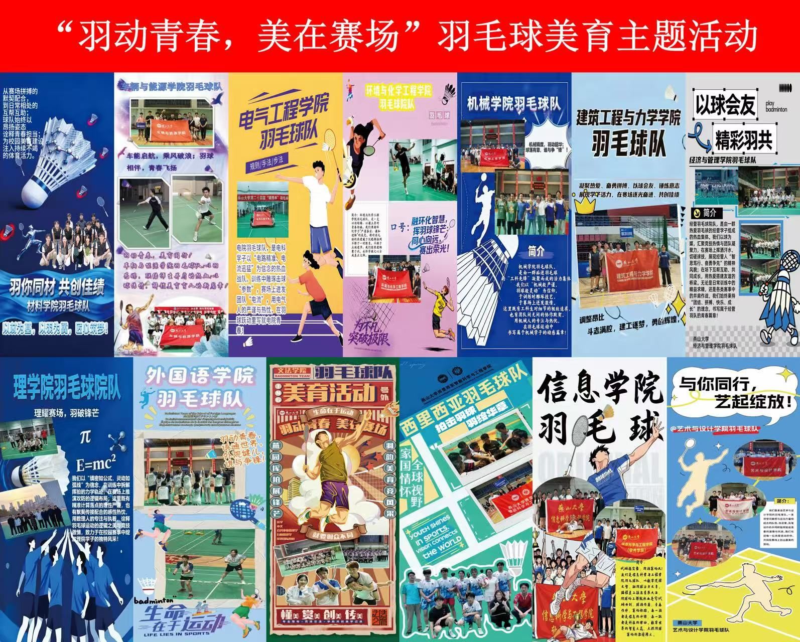 来自全校14个学院的代表队围绕本学院羽毛球队建设特色,精心策划并制作了主题鲜明、设计精美的易拉宝展板。展板内容涵盖球队发展历程、日常训练剪影、赛事荣誉展示以及“一院一品”品牌建设成果,通过图文并茂、创意十足的形式,全面呈现了各学院在羽毛球运动推广与美育融合方面的探索与成效。14个学院以“羽破长风,美润匠心”“羽战燕园,竞绽锋芒”“羽动青春,美在赛场”等为主题,展现各学院羽毛球队队员们拼搏奋进的精神风貌,突出“以美育人、以体育人”理念,充分彰显了体育之美、协作之美与青春之美。