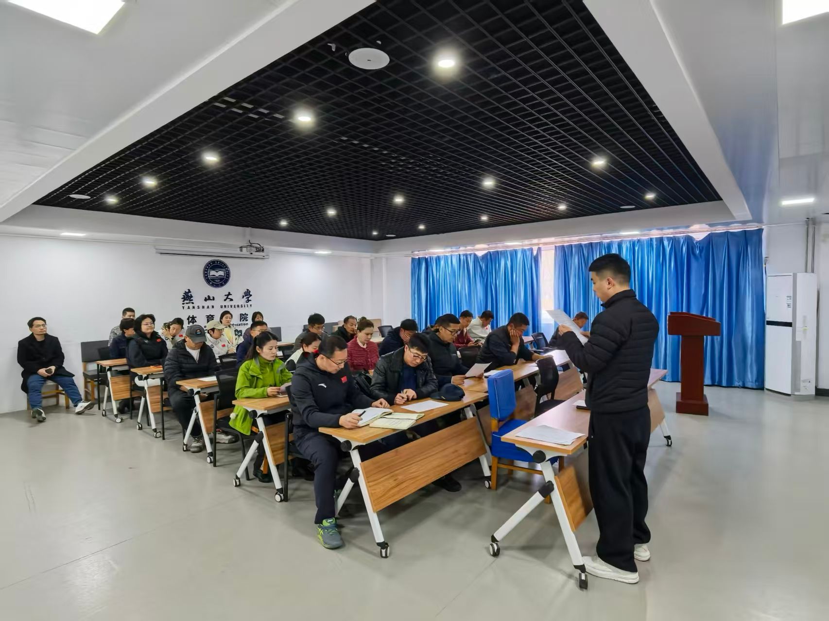 随后,陈杰教师围绕学生体质健康测试工作展开专项宣讲。他结合学院实际情况,详细解读了本次体质健康测试的工作流程、测试标准、人员分工、安全注意事项等核心内容,对测试前的学生信息核对、场地器材检查、安全须知告知,测试中的项目操作规范、秩序维护、突发状况处置,以及测试后的成绩统计、数据上报、结果反馈等各个环节进行了全面细致的讲解。同时,陈杰教师针对以往体测工作中出现的问题进行梳理总结,提出针对性改进措施,叮嘱全体教师熟练掌握工作要求,认真履行岗位职责,以严谨负责的态度完成各项工作任务,为学生提供规范、安全、贴心的体测服务。