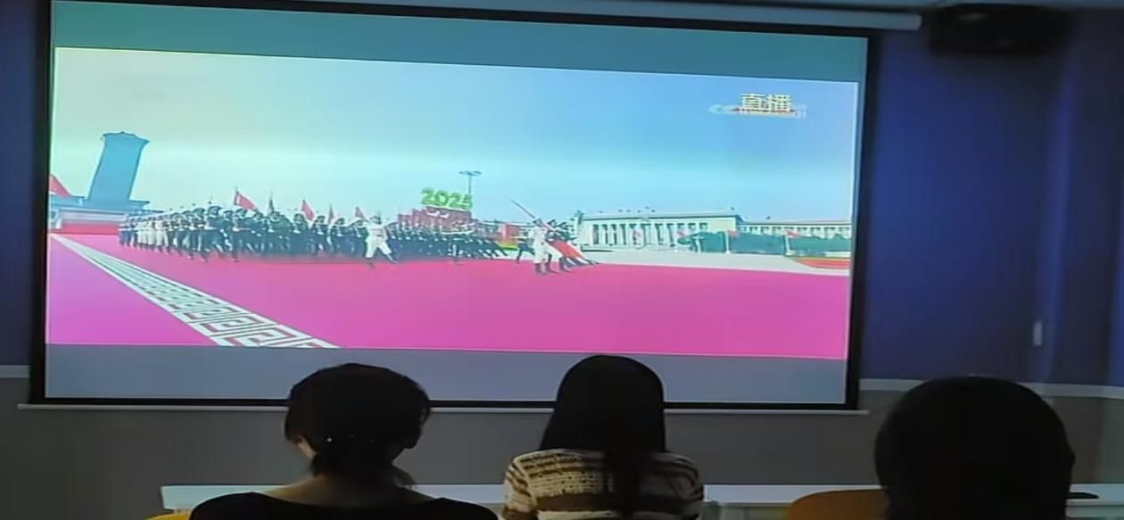 活动以“宣讲浸润 实践铸魂”为核心,构建全方位、多层次的教育体系,兼顾思想引领与实践体验,让爱国报国教育入脑入心、见行见效。组织全体学生集中收看阅兵仪式,威武雄壮的受阅队伍、先进的国防装备,让师生们直观感受国家发展的辉煌成就与人民军队的强大实力,现场不时响起阵阵掌声,民族自豪感与爱国热情在师生心中油然而生。教师引导大家从历史中汲取力量,将内心的爱国情转化为“努力学习 报效祖国”的实际行动。